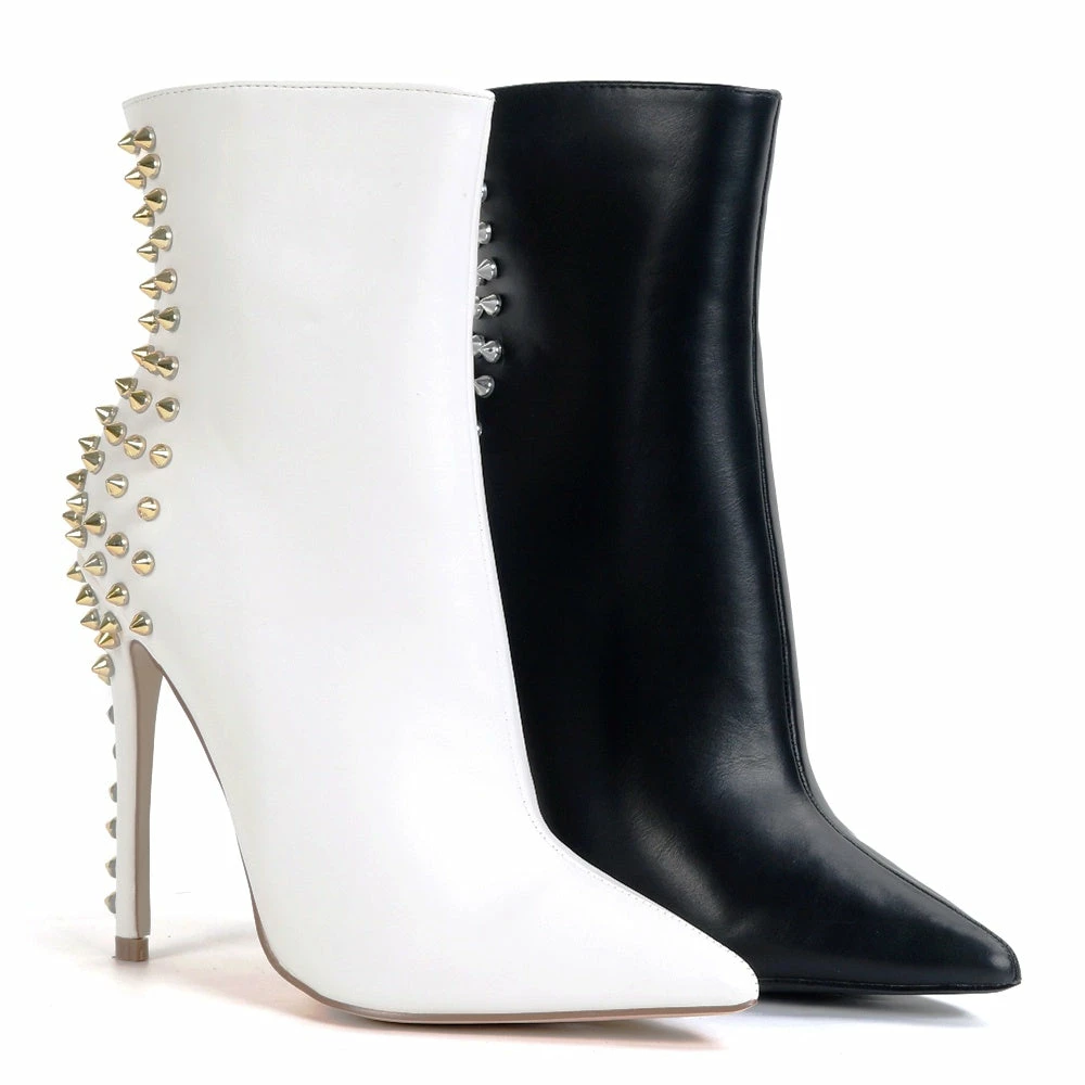 These striking ankle boots with heels feature a silhouette of a pointy toe, spikes at the back, and a slender stiletto heel. A lightly padded insole, fuzzy padding, and a side zipper closure are completed. Anti-skid and Robust Rubber Sole, comfortable and comfortable rubber sole mid-heel boots for ladies. Bold and fashionable, glamorous, and sophisticated, Castamere is a new lifestyle brand. An attractive closed toe built to demonstrate your elegance, easy and sexy to wear.