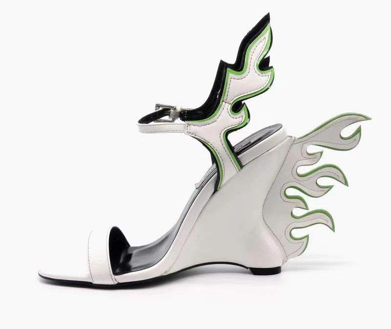 Flame accent wedge heel sandal. A statement is created by this exclusive designer fashion shoe, so move out in style. Fabulous in these beautiful wedges of flames. With these adorable, fashionable wedges, move into the summer weather season. Open toe construction, Trendy style, ankle strap with buckle closure, the durable sole provides tread, softly cushioned insole for comfort.