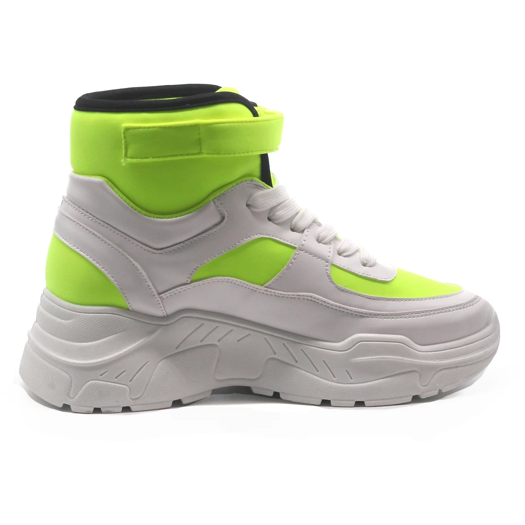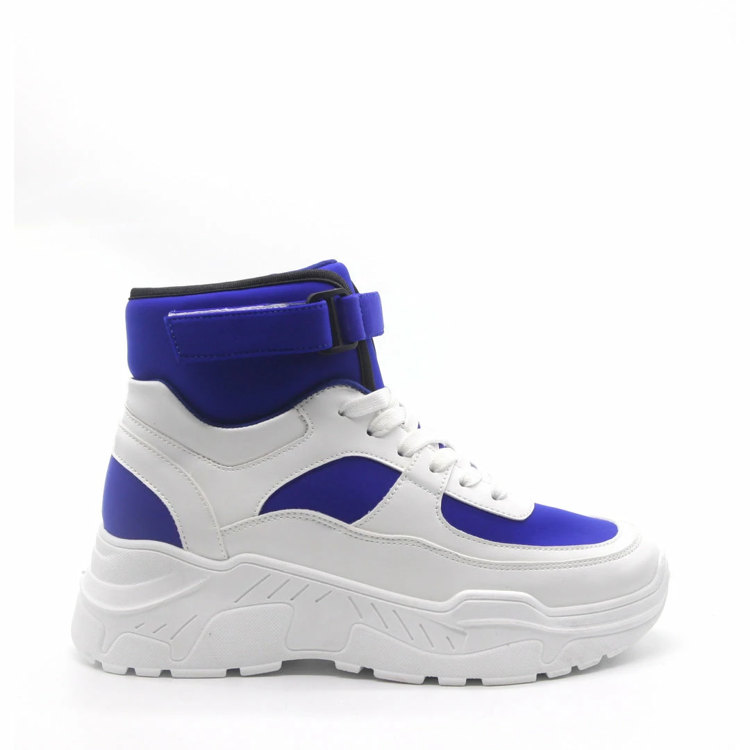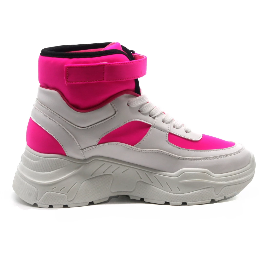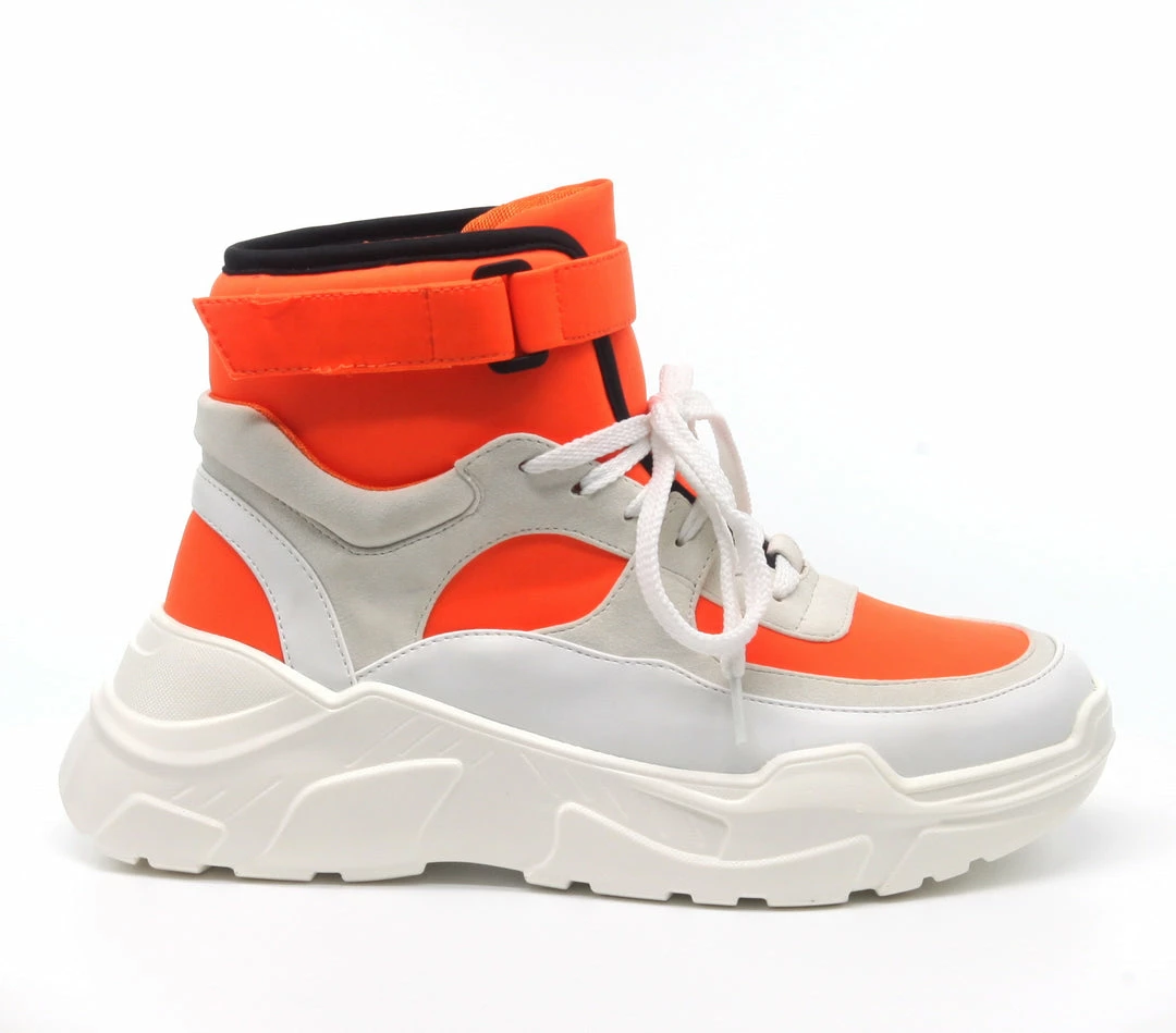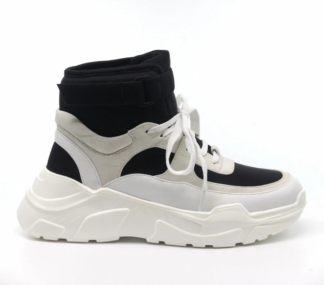 In love with this year’s trend for fashion chunky lace up sneakers. With its ankle height shaft, lace up closure, chunky, rubber heel, and Velcro, wrap around strap detail, The I’m In Love With The Flat Sneaker takes style signals from battle boots. The upper fabric features a vivid neoprene foundation with translucent textile accents and extensive faux leather. Design to finish the look with a tailored tee and high waist cargo.