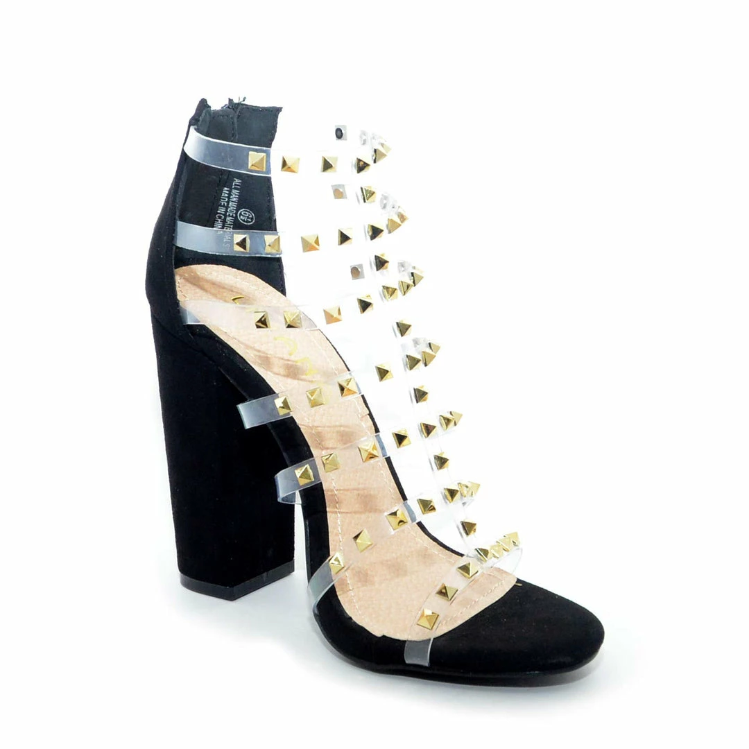 Item Type:Â Studded Clear Strap Block Chunky Heels